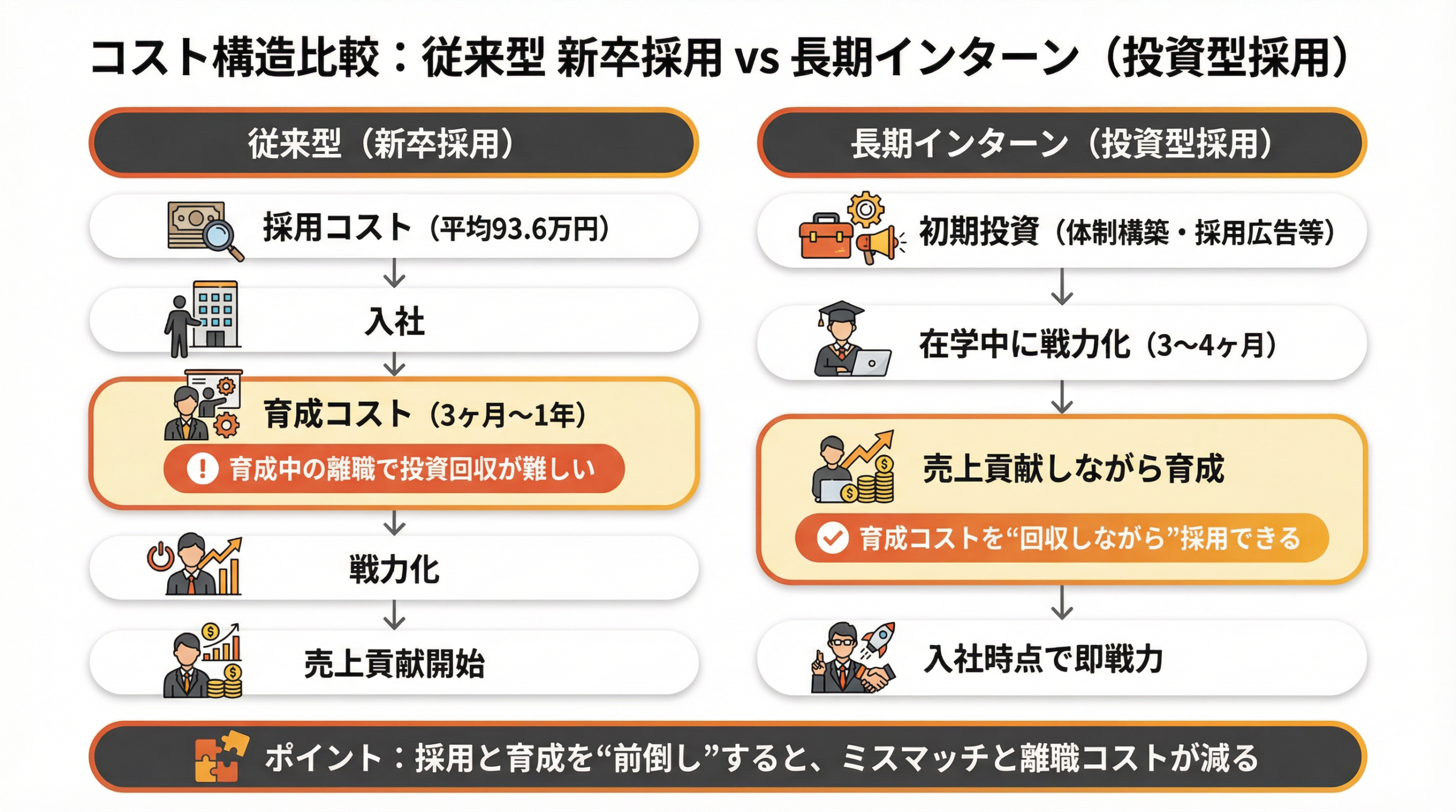 長期インターンは、従来の新卒採用とは全く異なるコスト構造を持ちます。