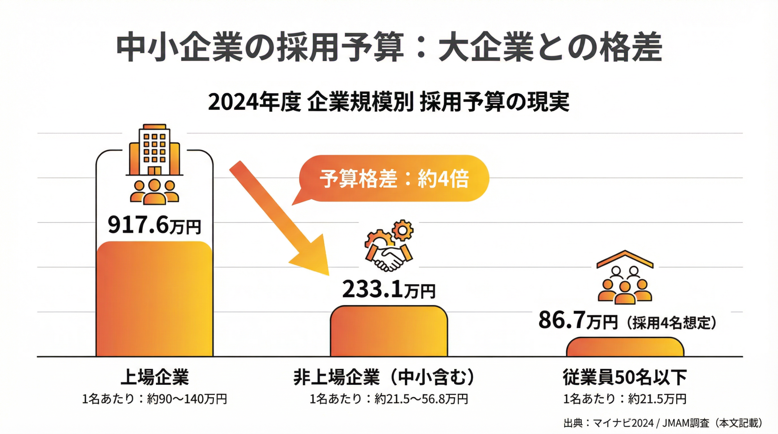 現実①:予算格差は約4倍 上場企業と中小企業では、年間採用予算に4倍以上の格差があります。【出典:JMAM中小企業採用戦略調査2024】