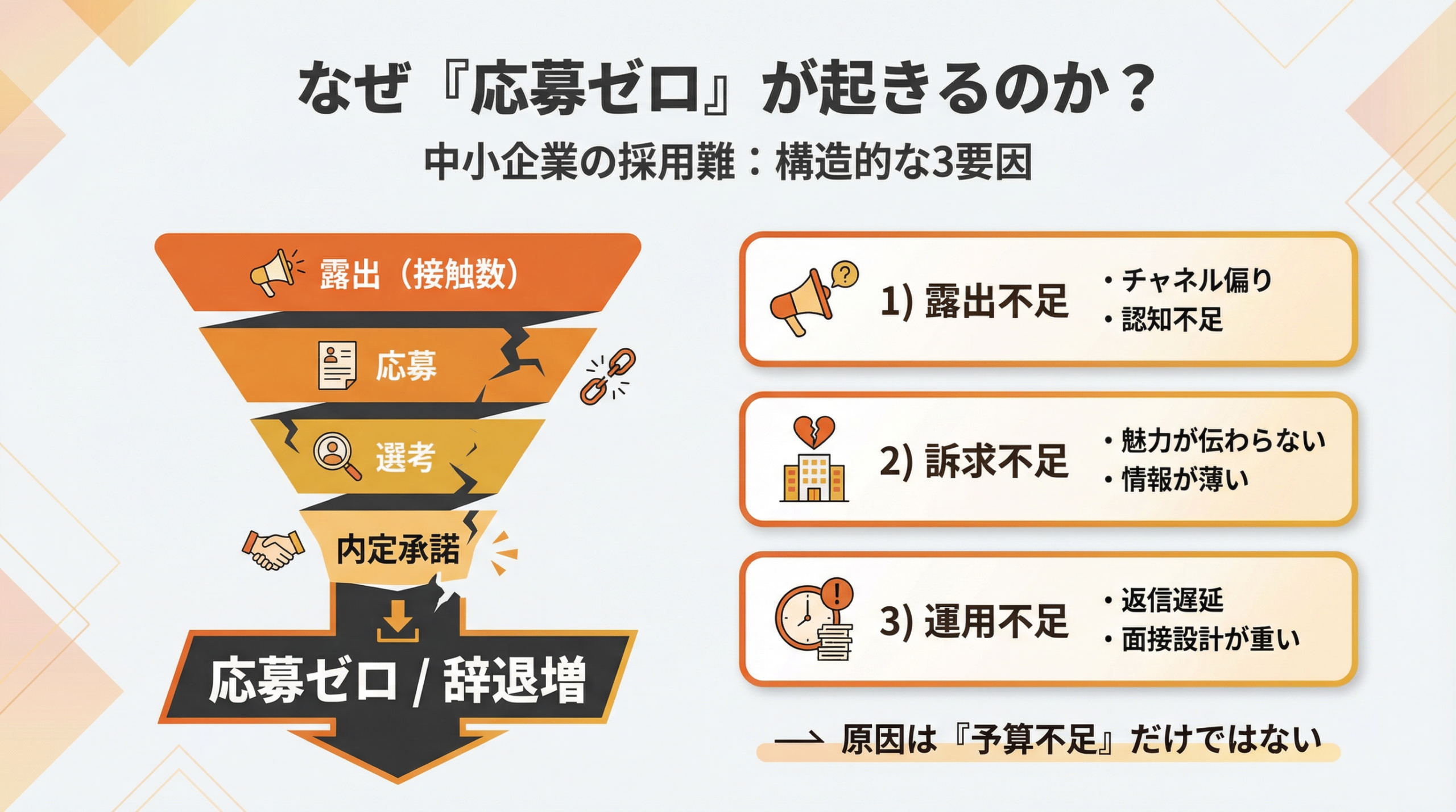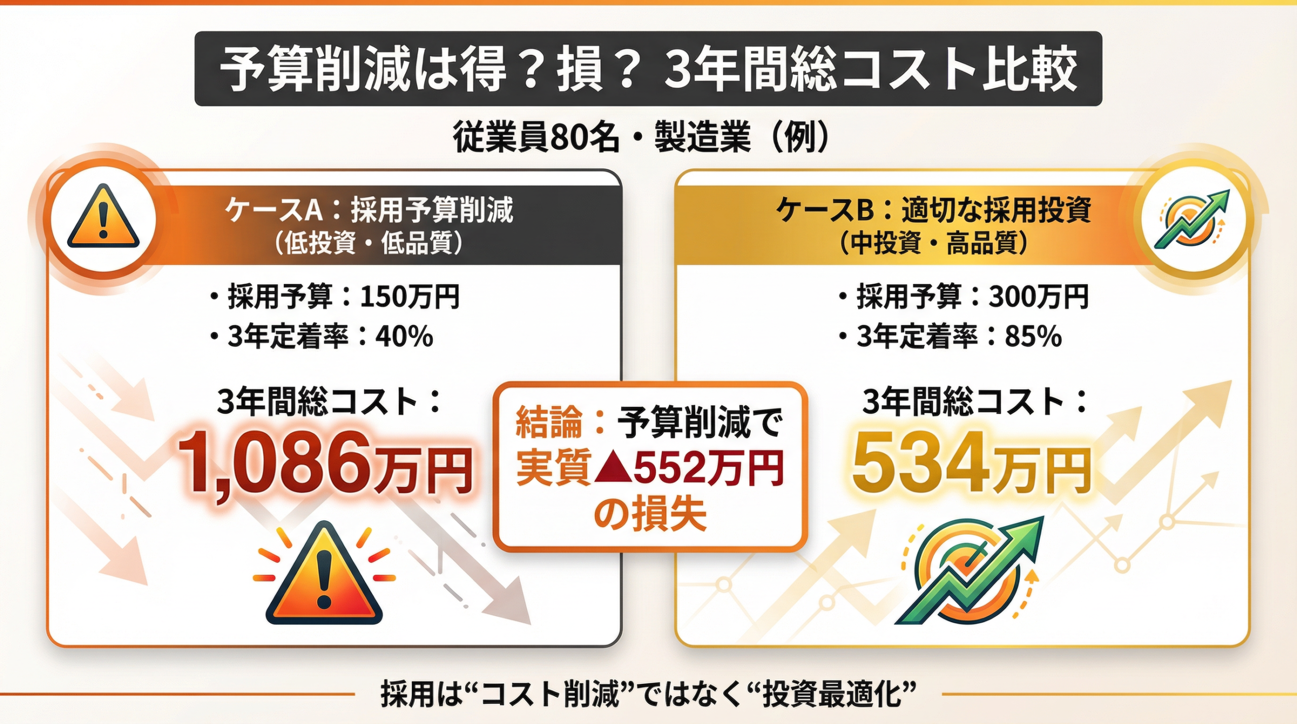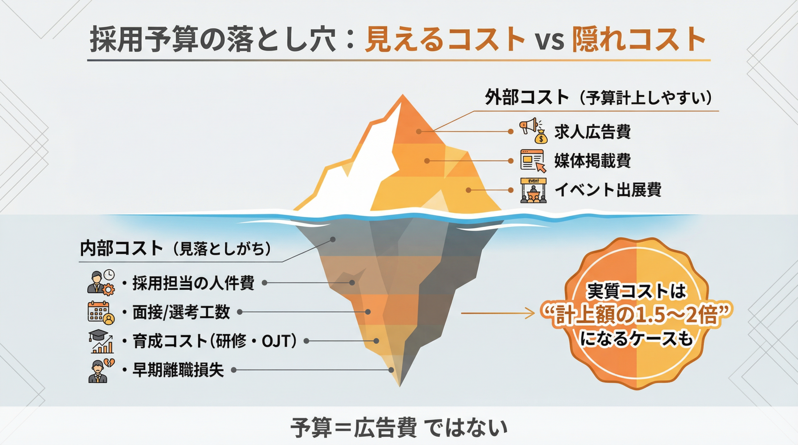 現実③:隠れコストの見落とし 中小企業の多くは「外部コスト(求人広告費等)」のみを予算計上し、内部コスト(担当者人件費・面接工数・育成コスト)を見落としがちです。実質的な採用コストは計上額の1.5〜2倍になるケースも。