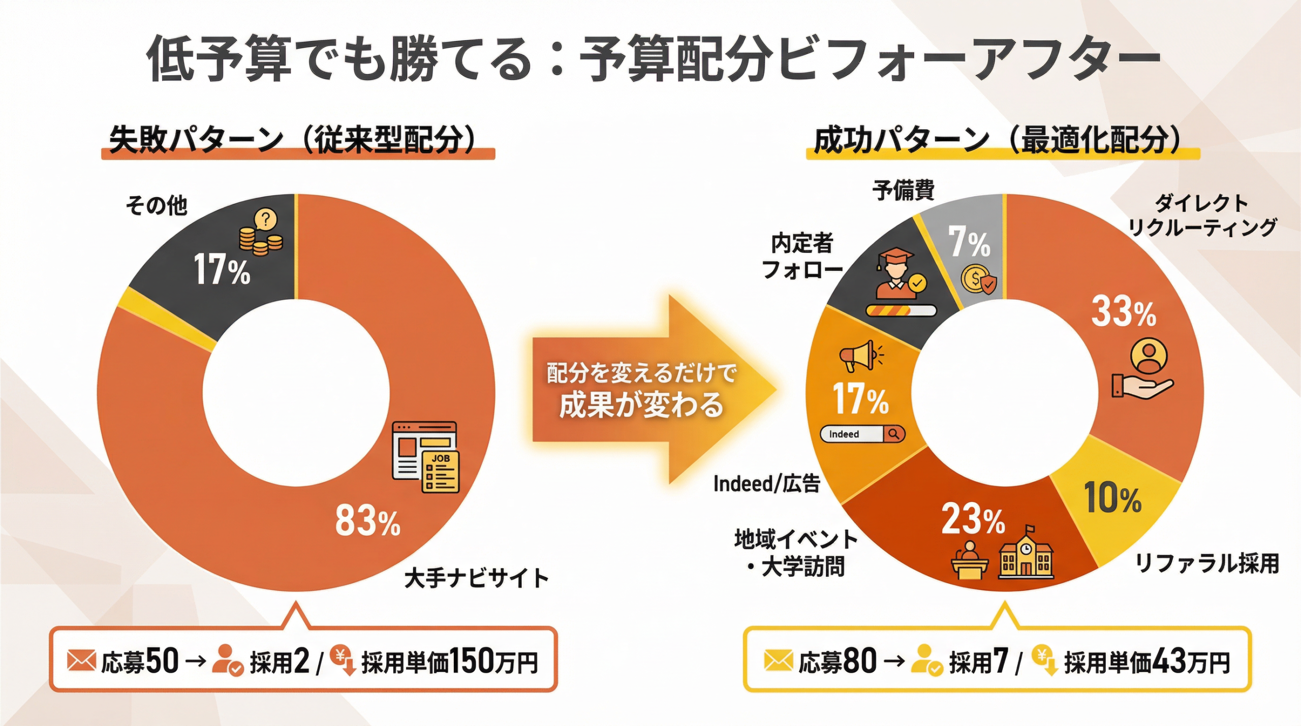 → ✅ 現実:予算200万円でも、ダイレクトリクルーティング・リファラル採用で年間5〜7名採用している中小企業は多数存在。