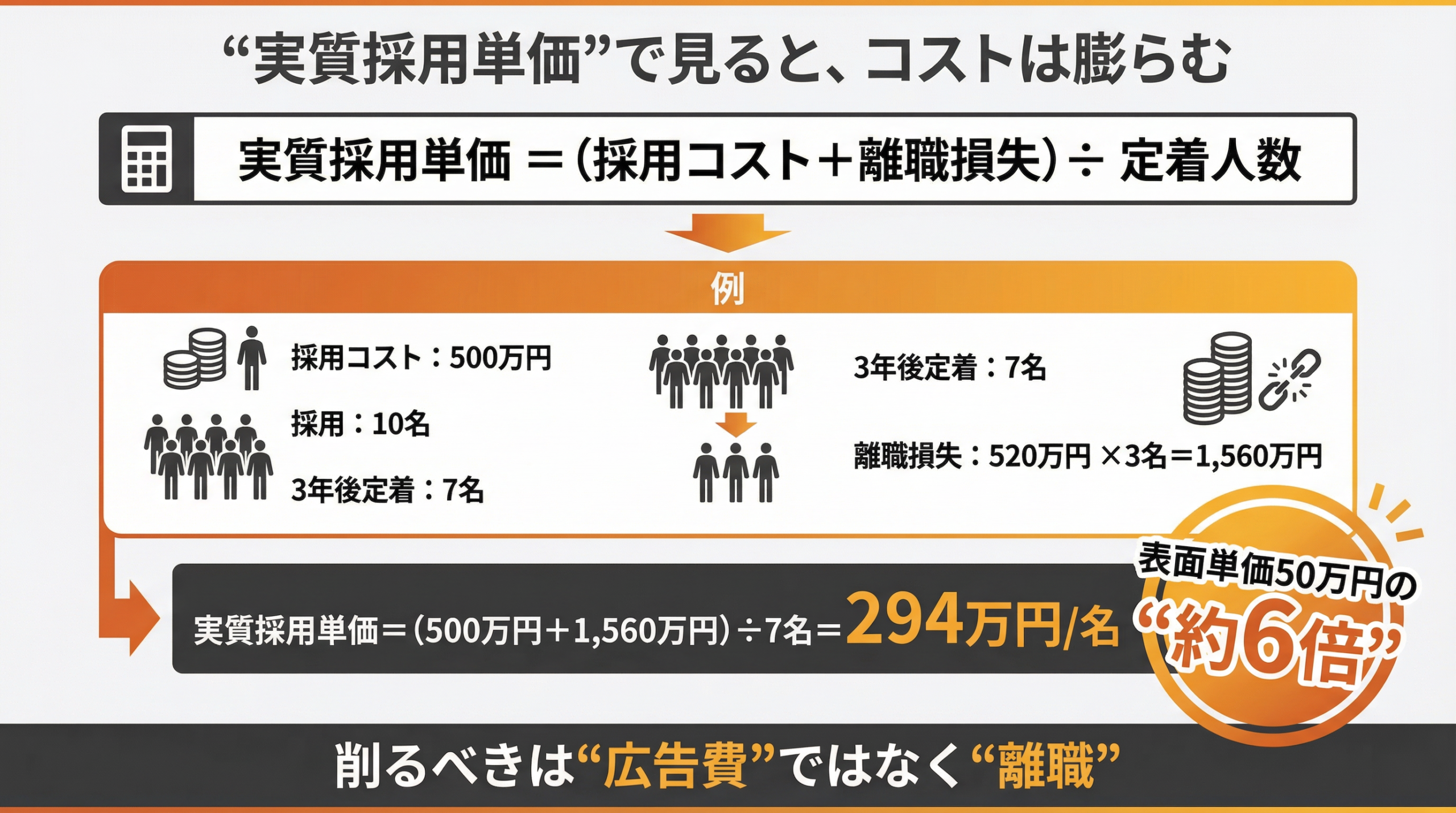 実質採用単価 = (採用コスト + 離職損失) ÷ 定着人数